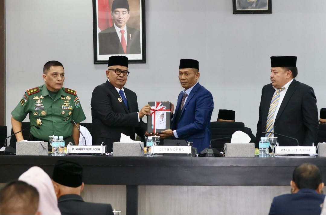BANDA ACEH – Penjabat (Pj) Gubernur Aceh Bustami Hamzah menyampaikan Laporan Keterangan Pertanggungjawaban Gubernur Aceh Tahun Anggaran 2023 dalam Sidang Paripurna Dewan Perwakilan Rakyat Aceh (DPRA), Senin 22 April 2024. Sidang paripurna itu dipimpin Ketua DPRA Zulfadli serta dihadiri para anggota dewan dan Forkopimda.