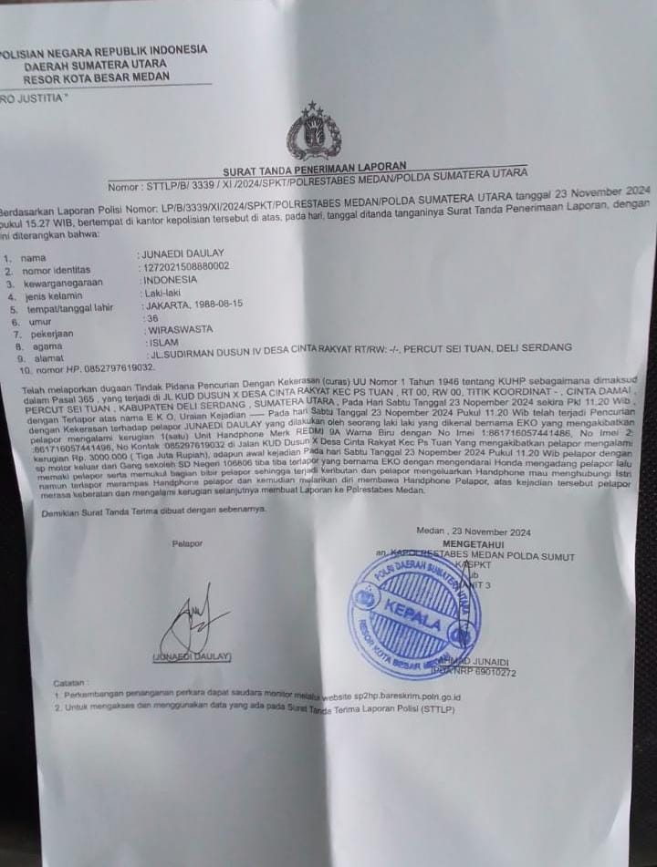 Deli Serdang, Tubinnews – Pimpinan Redaksi (Pimred) media Tubinews, Junaedi Daulay, melapor dugaan tindak pidana pencurian dengan kekerasan ke Polrestabes Medan pada Sabtu (23/11).