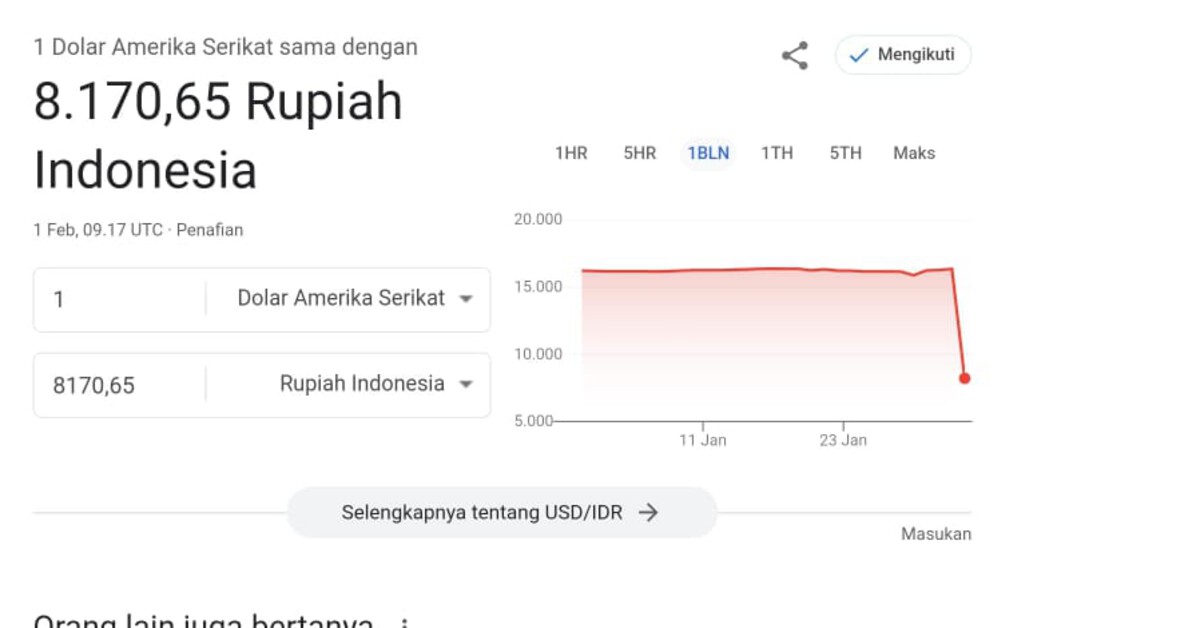 Tubinnews.com – Warganet dihebohkan dengan tampilan nilai tukar dolar AS terhadap rupiah di mesin pencari Google yang menunjukkan angka sekitar Rp8.170.65 per dolar AS pada Sabtu, (1/2/2025). Angka ini jauh berbeda dari kurs sebenarnya yang berada di kisaran Rp16.000 per dolar AS.