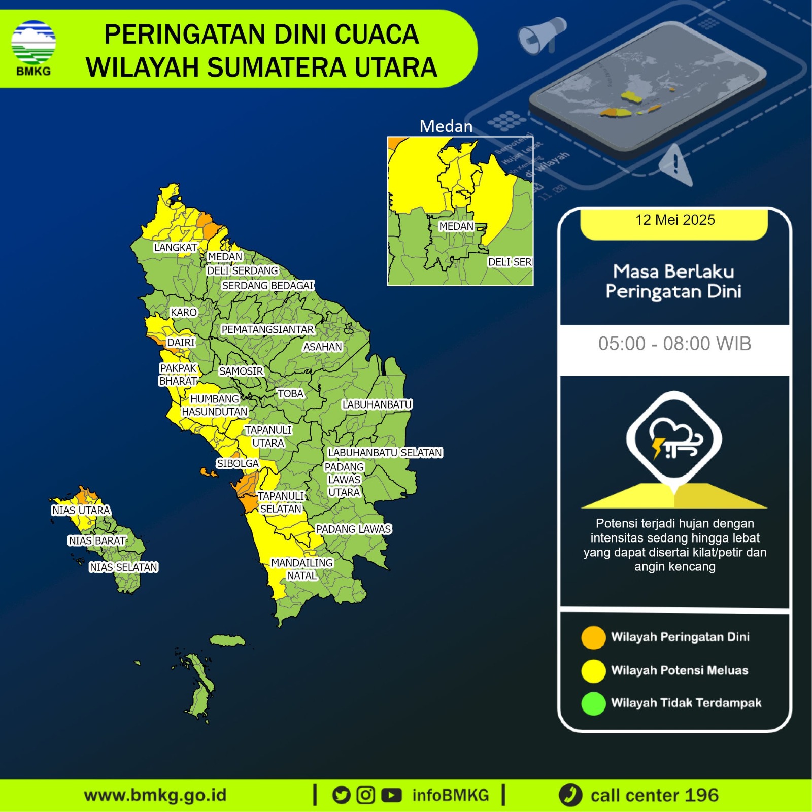 Medan | Tubinnews.com – Badan Meteorologi, Klimatologi, dan Geofisika (BMKG) Sumatera Utara mengeluarkan peringatan dini cuaca ekstrem pagi ini. Berdasarkan update pada pukul 04:50 Senin 12 Mei 2025 WIB, wilayah Sumatera Utara diperkirakan akan mengalami hujan sedang hingga lebat yang disertai kilat, petir, dan angin kencang mulai pukul 05:00 WIB.