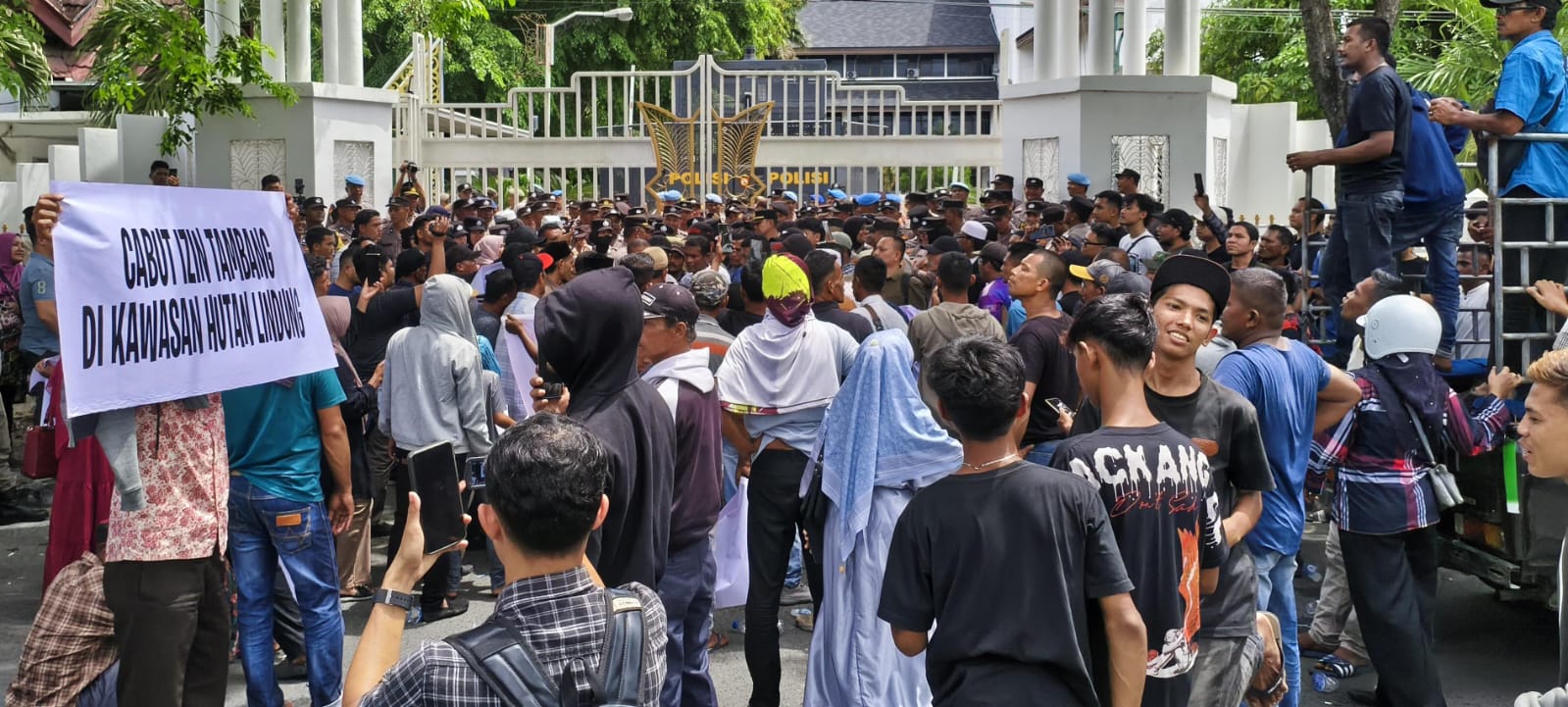 Pantauan Tubinnews di lapangan, massa yang berkumpul di depan gerbang Kantor Gubernur Aceh membawa alat peraga berupa sepanduk yang bertuliskan beberapa tuntutan diantaranya, penolakan pendirian 4 batalyon di Aceh, permintaan pencopotan Tito Karnavian sebagai Menteri Dalam Negeri (Mendagri), hingga permintaan pencabutan izin tambang di kawasan hutan lindung.