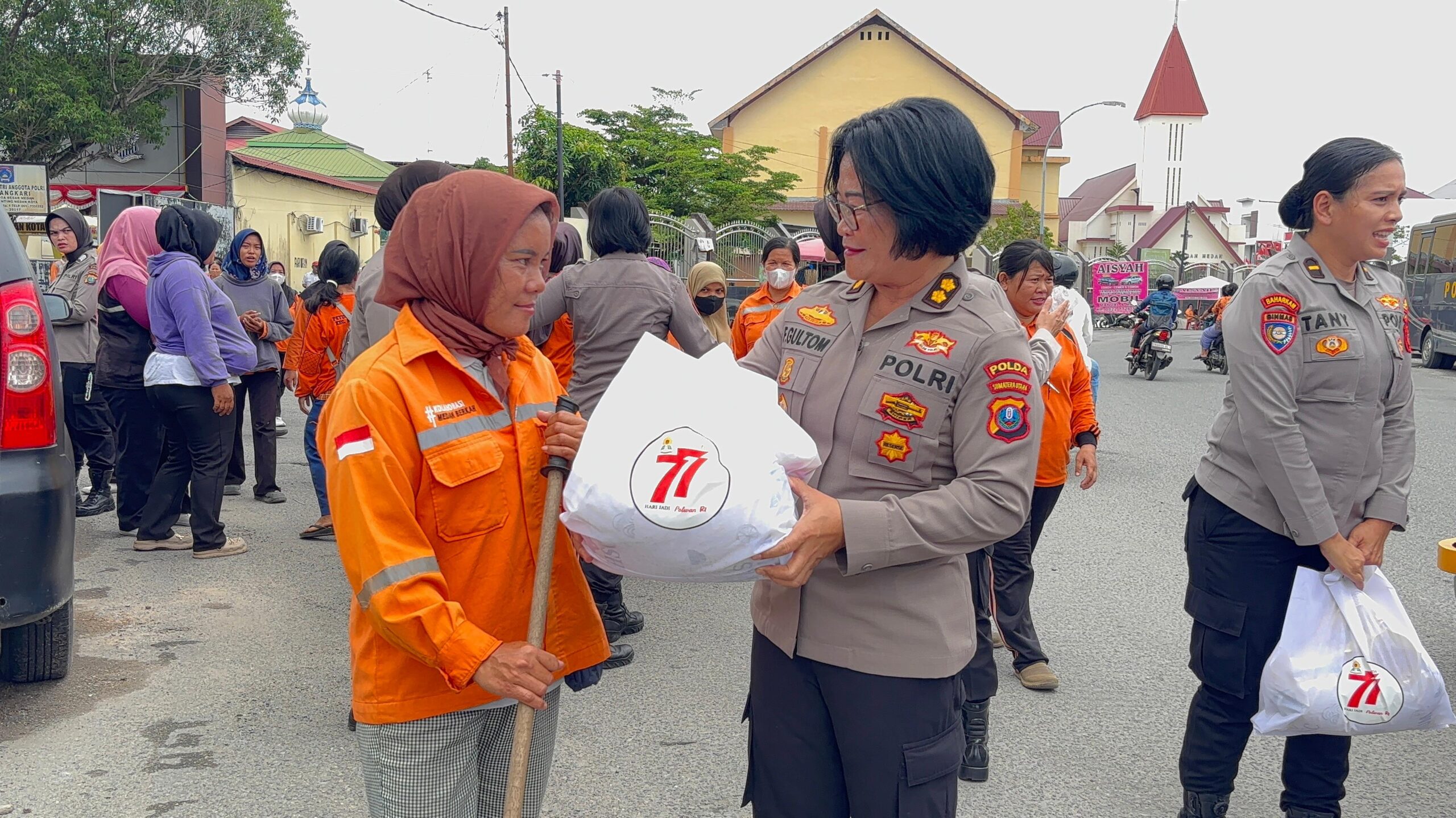 Setelah itu, rombongan Polwan bergerak menyapa para penyapu jalanan di Kecamatan Medan Kota dan Medan Amplas, sekaligus menyerahkan seratus lima puluh paket sembako sebagai bentuk penghargaan atas jasa mereka menjaga kebersihan kota.