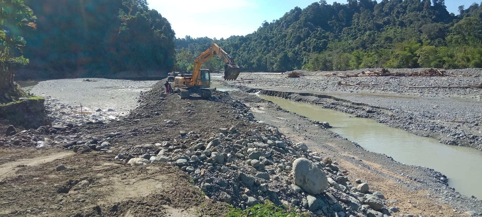 Alat berat dikerahkan Pemkab Aceh Barat dan TNI memperbaiki jalan Jambak–Sikundo yang putus akibat banjir bandang.