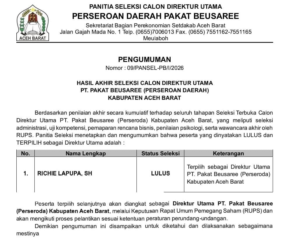 Peserta yang dinyatakan lulus dan terpilih sebagai Direktur Utama PT Pakat Beusaree (Perseroda) Kabupaten Aceh Barat adalah Richie Lapupa.
