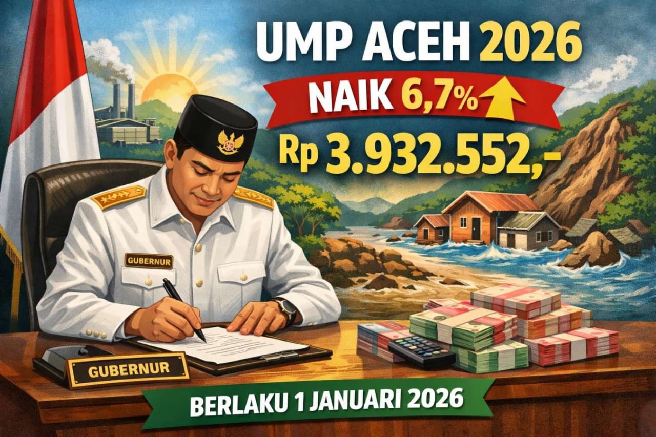 Banda Aceh | TubinNews.com — Pemerintah Aceh resmi menetapkan Upah Minimum Provinsi (UMP) Aceh Tahun 2026 sebesar Rp3.932.552. Penetapan tersebut tertuang dalam Keputusan Gubernur Aceh tentang UMP Aceh Tahun 2026 serta Keputusan Gubernur tentang Upah Minimum Sektoral Provinsi (UMSP) Aceh Tahun 2026.