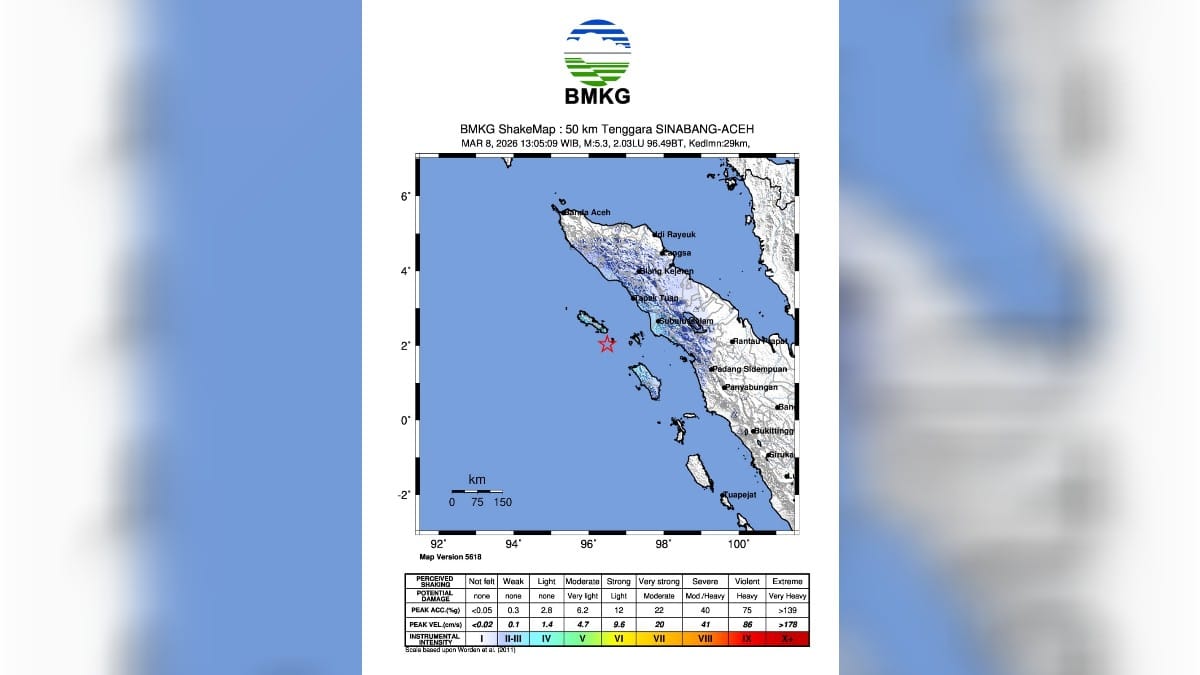 Simeulue | TubinNews.com – Gempa bumi tektonik berkekuatan 5,3 magnitudo kembali mengguncang Kabupaten Simeulue, Aceh, pada Minggu (8/3/2026) pukul 13.05 WIB.