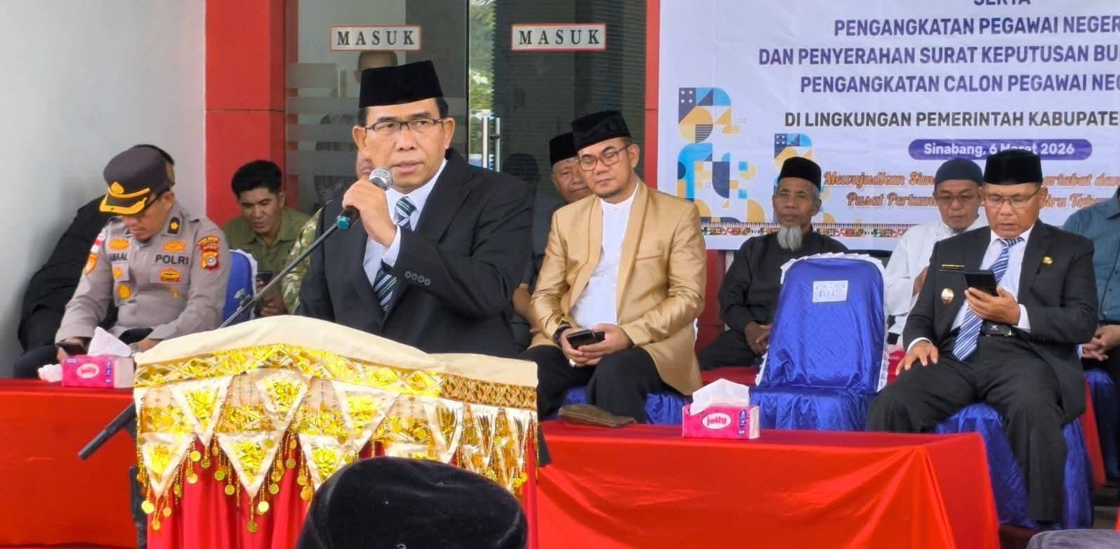 Pelantikan tersebut dirangkaikan dengan pengambilan sumpah jabatan, pengangkatan 31 Pegawai Negeri Sipil (PNS), serta penyerahan Surat Keputusan (SK) kepada Calon Pegawai Negeri Sipil (CPNS). Kegiatan berlangsung di halaman Kantor Bupati Simeulue, Jumat (6/3/2026).