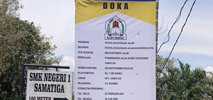 Fadly menjelaskan peningkatan ruas jalan akses menuju puskesmas Samatiga dan menuju fasilitas pendidikan saat ini dalam tahap pekerjaan lapis pondasi. Proyek ini, kata dia, dikerjakan oleh CV Rahmad dengan pagu anggaran sebesar Rp1.330.400.000,- yang bersumber dari Dana Otonomi Khusus Aceh (DOKA) tahun anggaran 2026. Dan diharapkan tuntas pada bulan Juni 2026 sesuai dokumen kontrak.