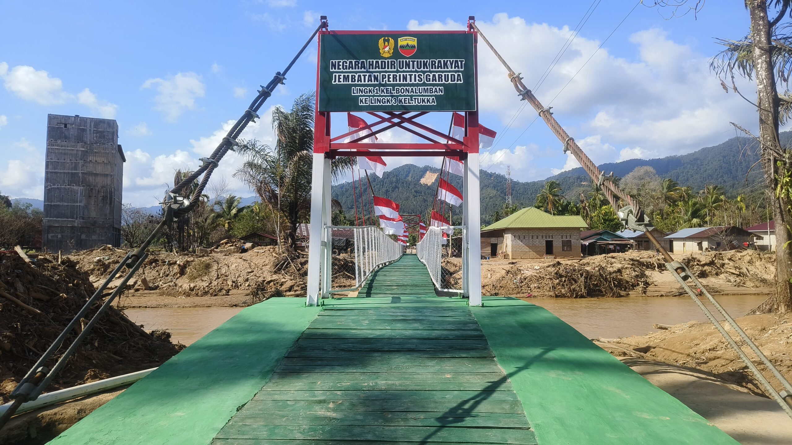 Tapanuli Tengah | Tubinnews.com — Satgas Penanggulangan Bencana Alam (Gulbencal) Kodam I/BB melalui Kodim 0211/TT berhasil menuntaskan pembangunan Jembatan Perintis Garuda yang menghubungkan Lingkungan I, Kelurahan Bonalomban, ke Lingkungan III, Kelurahan Tukka, Kecamatan Tukka, Kabupaten Tapanuli Tengah, Minggu (1/3/2026).