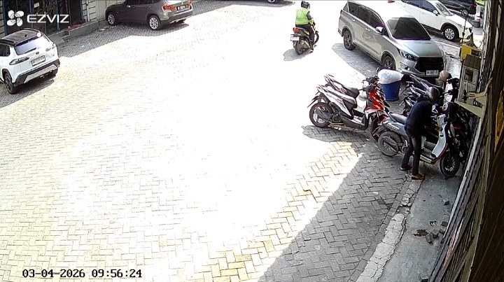 Berdasarkan rekaman CCTV yang beredar, terlihat dua pria berboncengan menggunakan sepeda motor. Salah satu pelaku tampak mengenakan jaket berwarna hijau khas ojol dan helm, sementara rekannya duduk di belakang sambil memantau situasi sekitar.